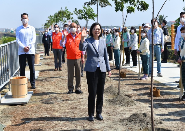 今日蔡英文總統手植樹苗為水圳綠道啟用後,同步視訊連線各場地並揮手致意,也表示今年植樹月的主題為「森活的碳循」,我們在全國推廣種植原生樹種,維持森林覆蓋率以抵銷碳排放,也持續加強建設農田水利,保障灌溉水源,建構更有韌性的農業生產環境,今天啟用的水圳綠道是最好的示範。