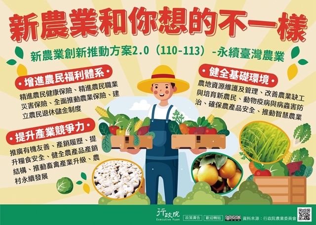 為引導我國農業朝向永續發展,政府續推動「新農業創新推動方案2.0」,期透過健全基礎環境、增進農民福利體系及 提升產業競爭力等3大主軸,力求農業、農民、農村向永續 道路邁進。