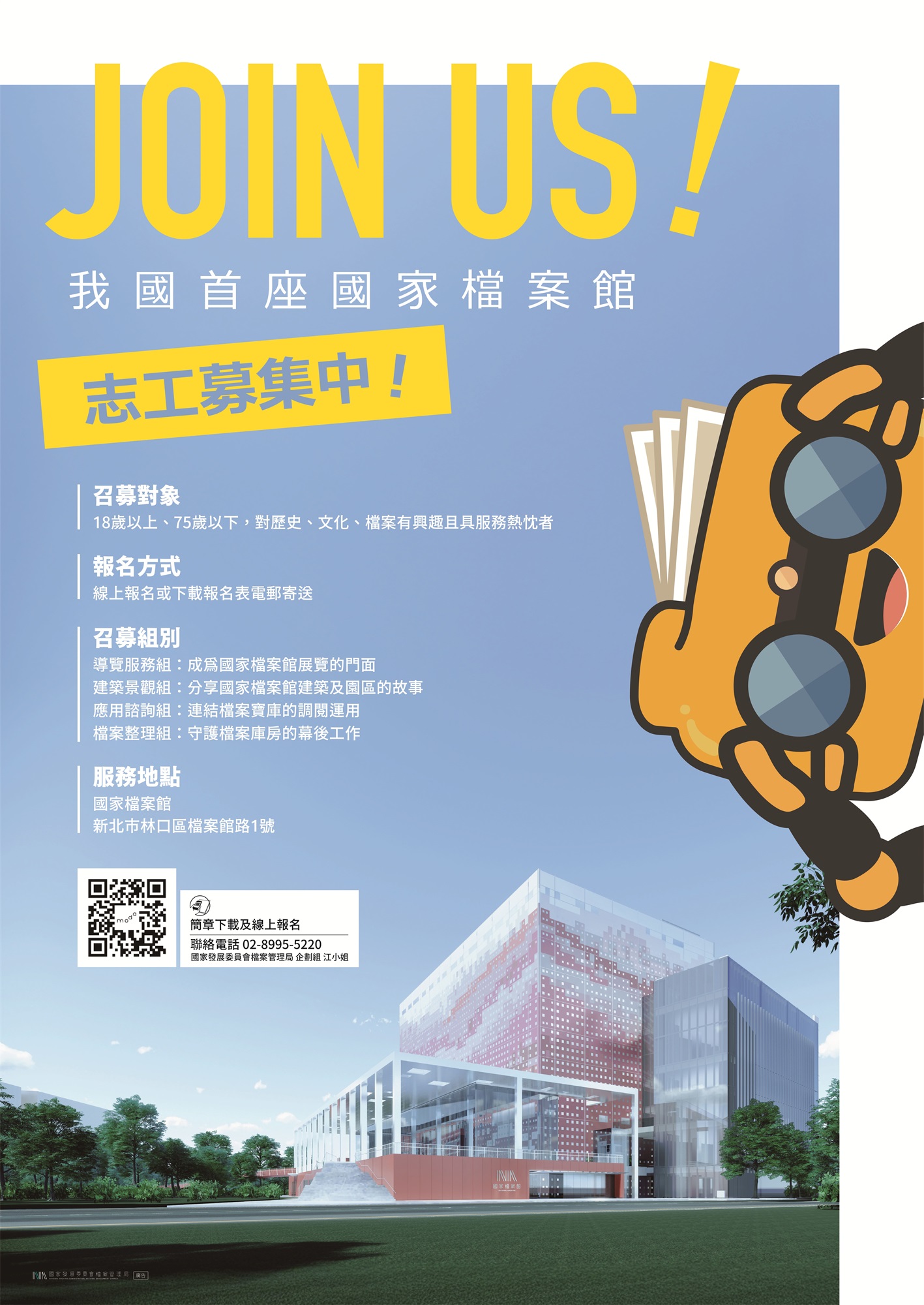 2.電郵報名:請填復報名表並以電郵寄至schiang@archives .gov.tw,信件主旨請敘明「報名國家檔案館志工」。