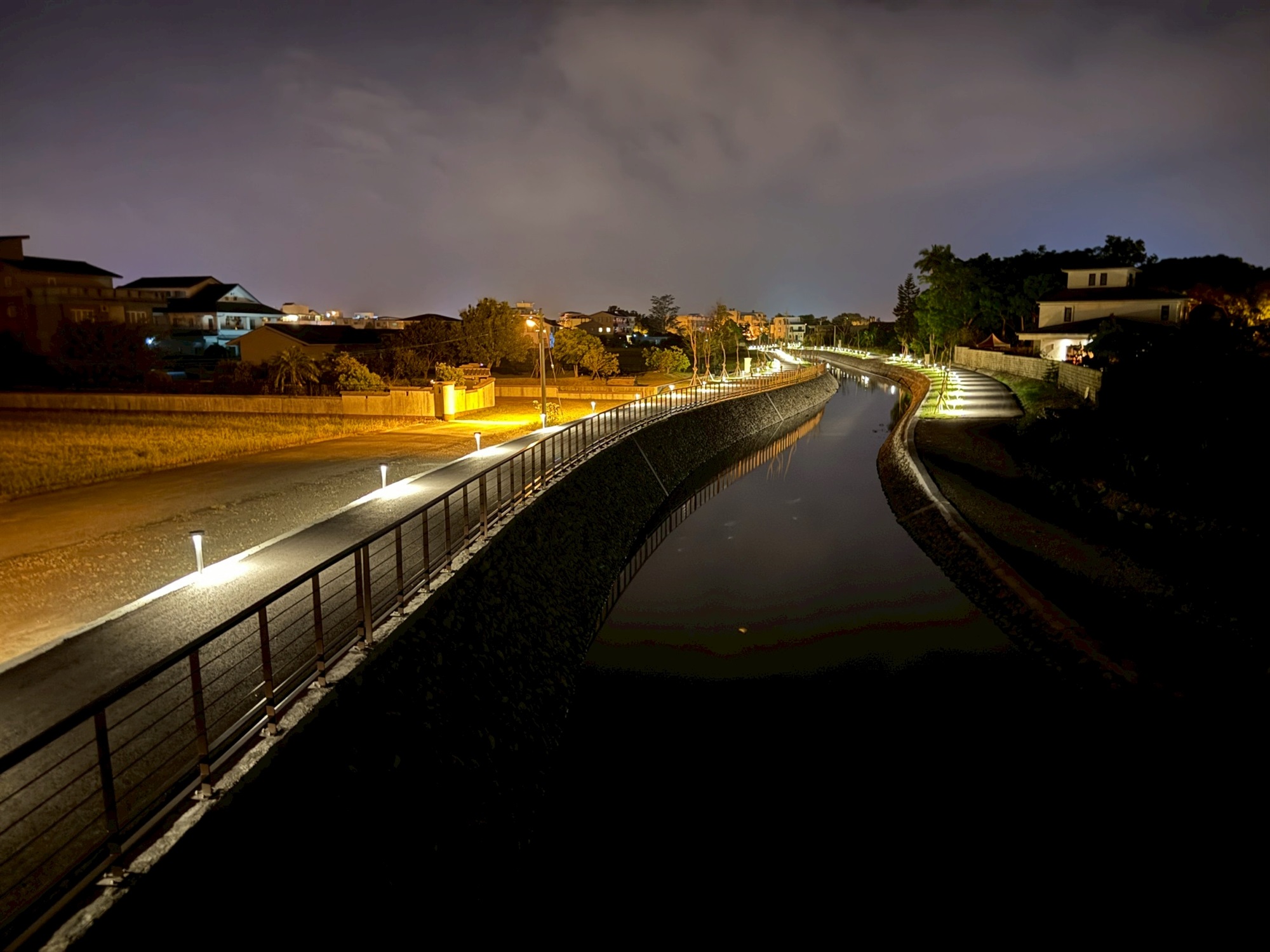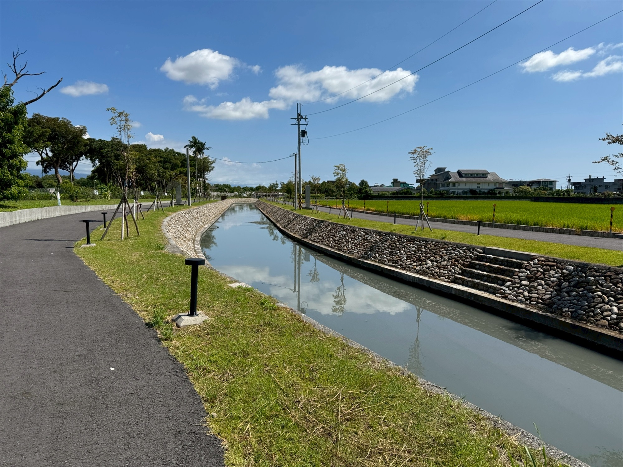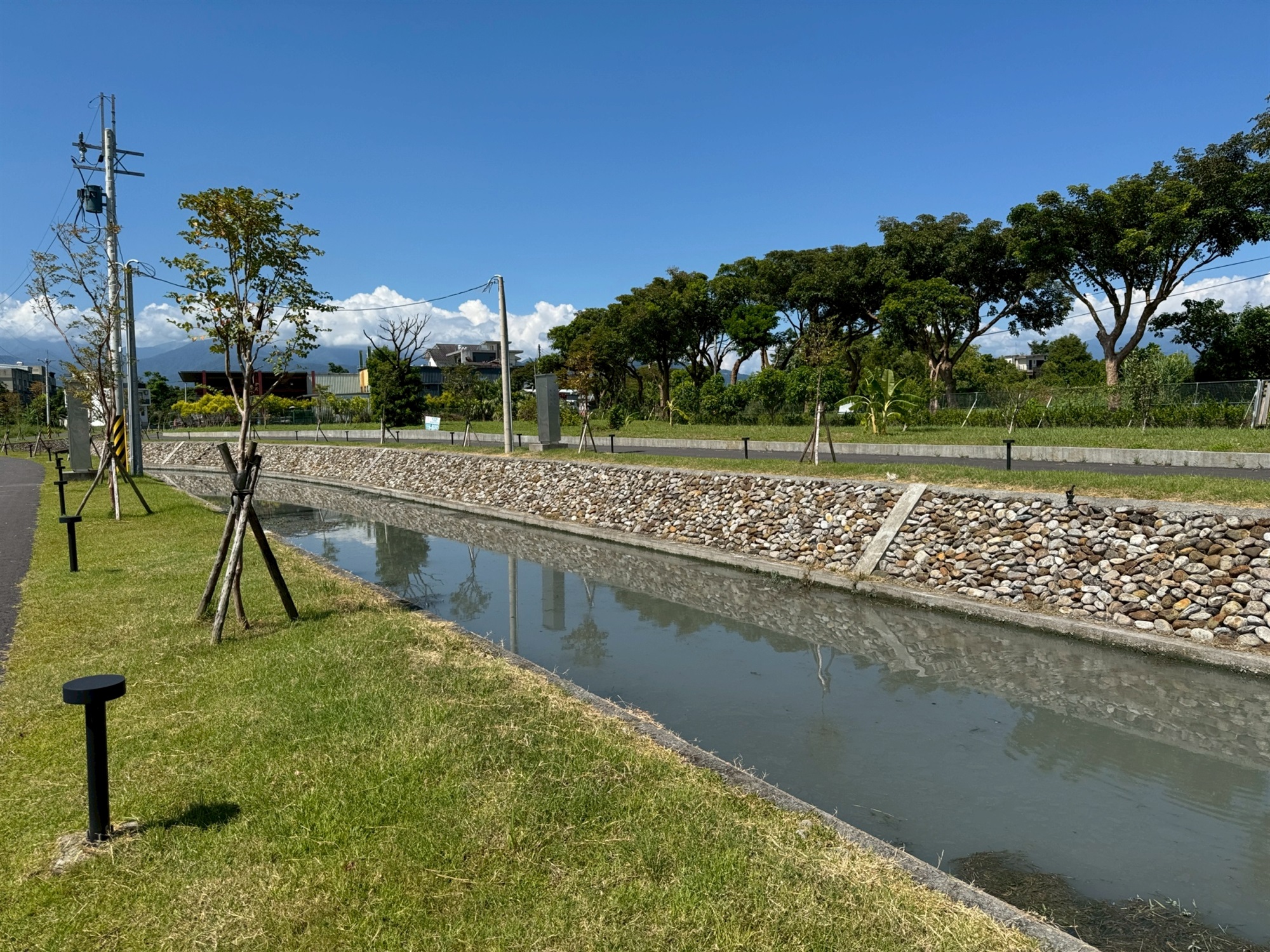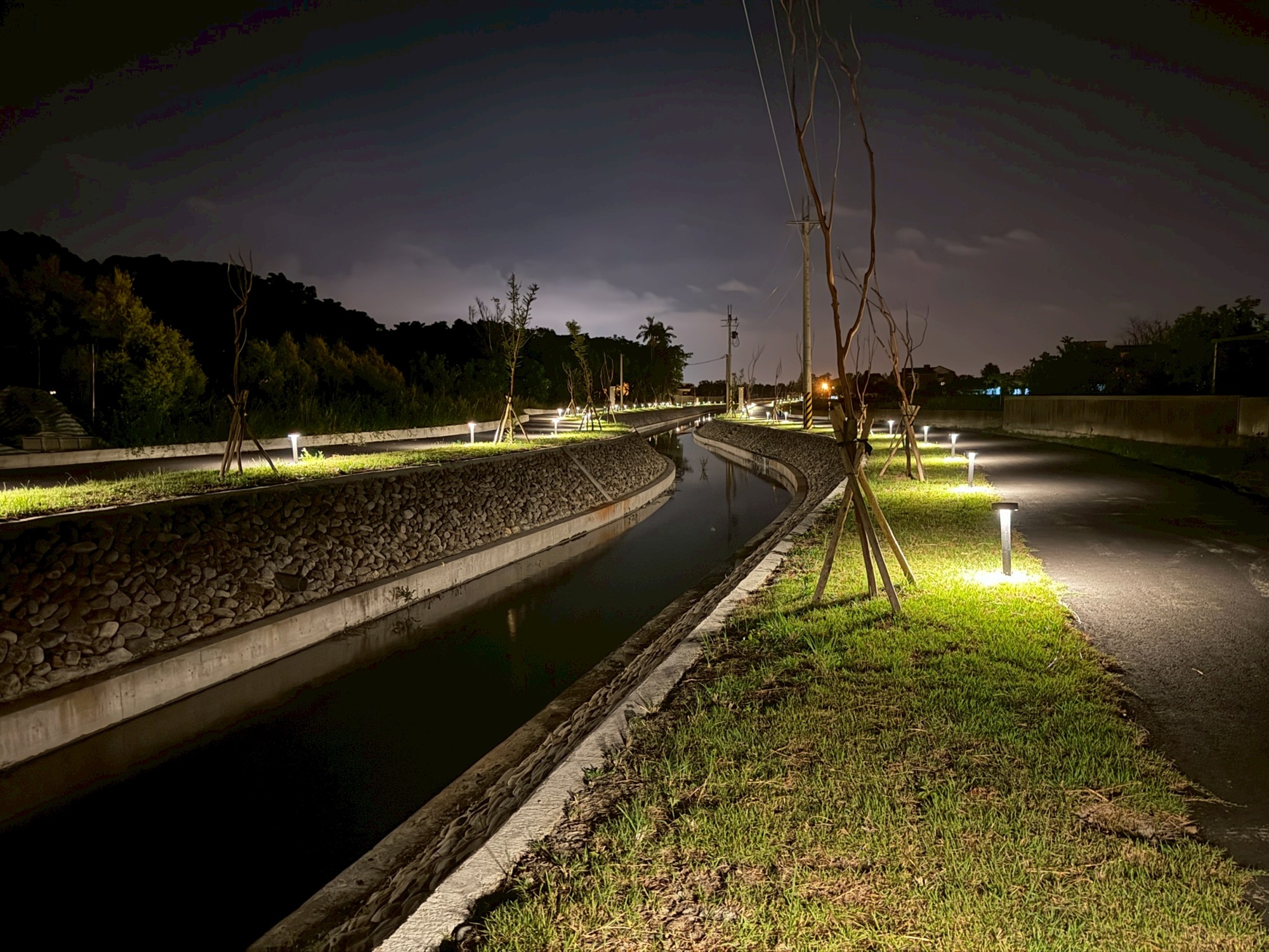 2.水防道路闢建951公尺:考量日後維護管理需求,於兩岸闢建水防通道,寬度約3公尺;另因地方建議增設亮點,故將水防道路鋪設瀝青混凝土、設置景觀步道燈及綠美化措施,提供本處定期巡防及民眾休閒使用。