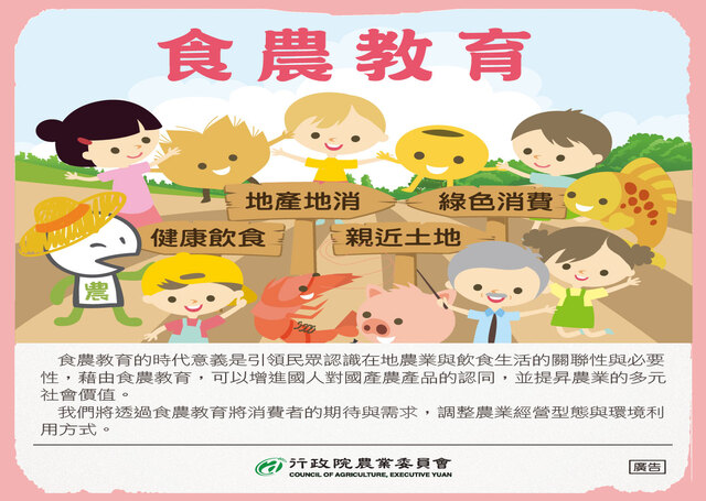 農委會指出,為落實食農教育該會委託國立臺灣師範大學規劃食農教育教學知能手冊,以12年國教課程綱要精神,將食農教育定位為「議題」,依據國小、國中、高中(職)不同學習階段特性發展食農教育學習內涵及教學示例,提供各級學校作為課程設計與教學實施的參考,以期透過學校及在地農業相關團體合作,深耕食農教育,帶動家庭、社區的全面參與,達成全民食農教育的目標。