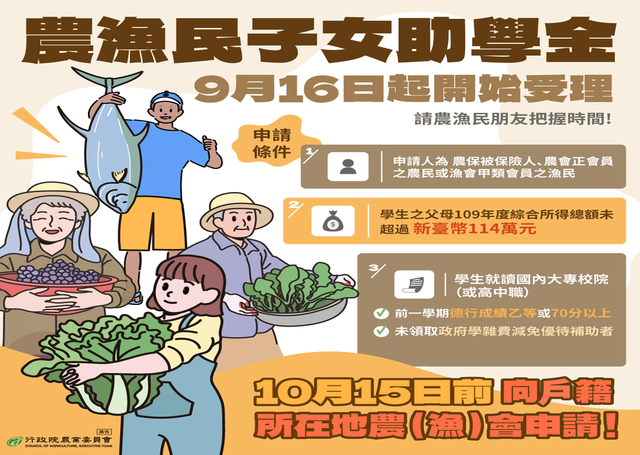 行政院農業委員會為協助農漁民子女繼續升學,設有助學金的機制,110學年度第1學期農漁民子女助學金於9月16日開始受理申請,請農漁民朋友把握時間,於10月15日前向戶籍所在地基層農(漁)會申請。