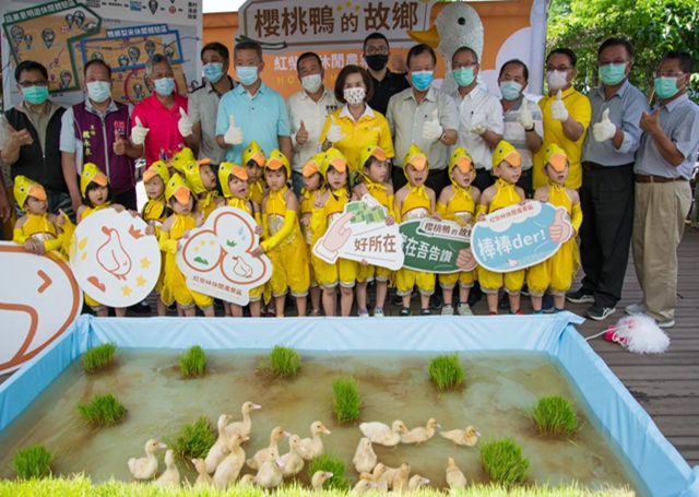 今天記者會也啟動「傳承-與鴨共生」,以鴨共生之農作方式為發想,發放小小櫻桃鴨給各長官貴賓以及幼兒園小朋友,一起將手中的小小鴨放入水池中,代表著三星鄉的優良土地、水質及作物與鴨共生之農村智慧傳承,亦象徵「櫻桃鴨的故鄉就在紅柴林休閒農業區」之意象。