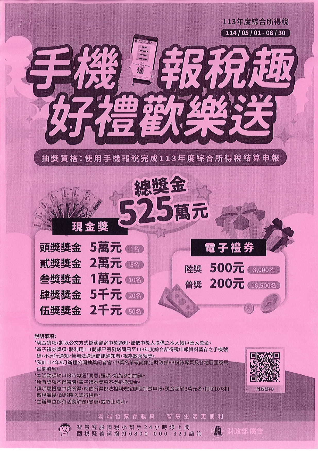 113年度個人綜合所得稅申報期間提供綜所稅手機報稅超貼心及手機報稅趣好禮歡樂送活動訊息